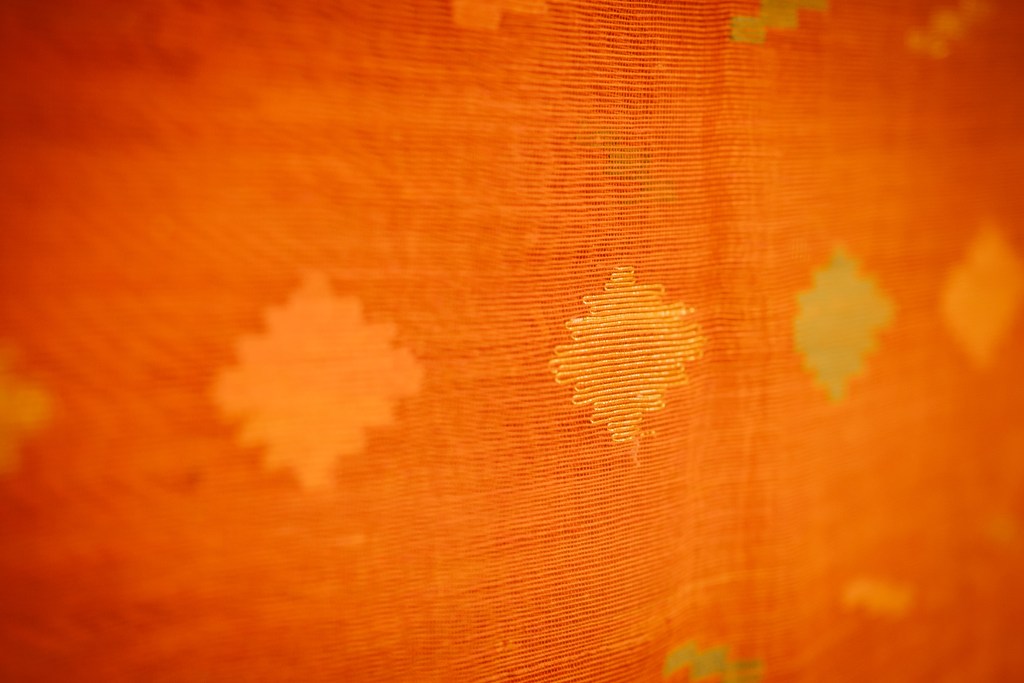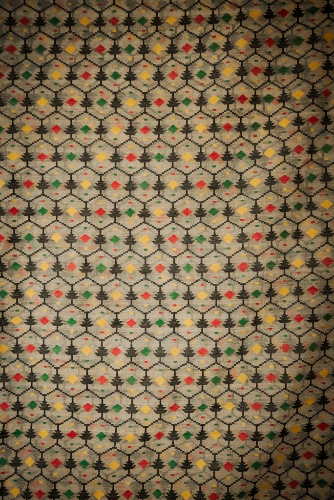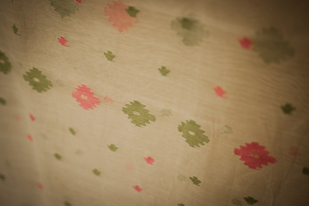 ‘Jamdani’ means flowered motif in Persian, although the roots of this textile are much earlier in South Asia where records have shown that as early as 300AD flowered motifs on fine cotton have been depicted on carved depictions of Hindu gods and deities inside temples. They have been found inside the Moghul courts of the 1600s and used on garments for the English (1600-1900) who had started to bring Jamdani to England. Today flowered motifs are still woven onto fine cotton (muslin) saris and worn on special occasions.