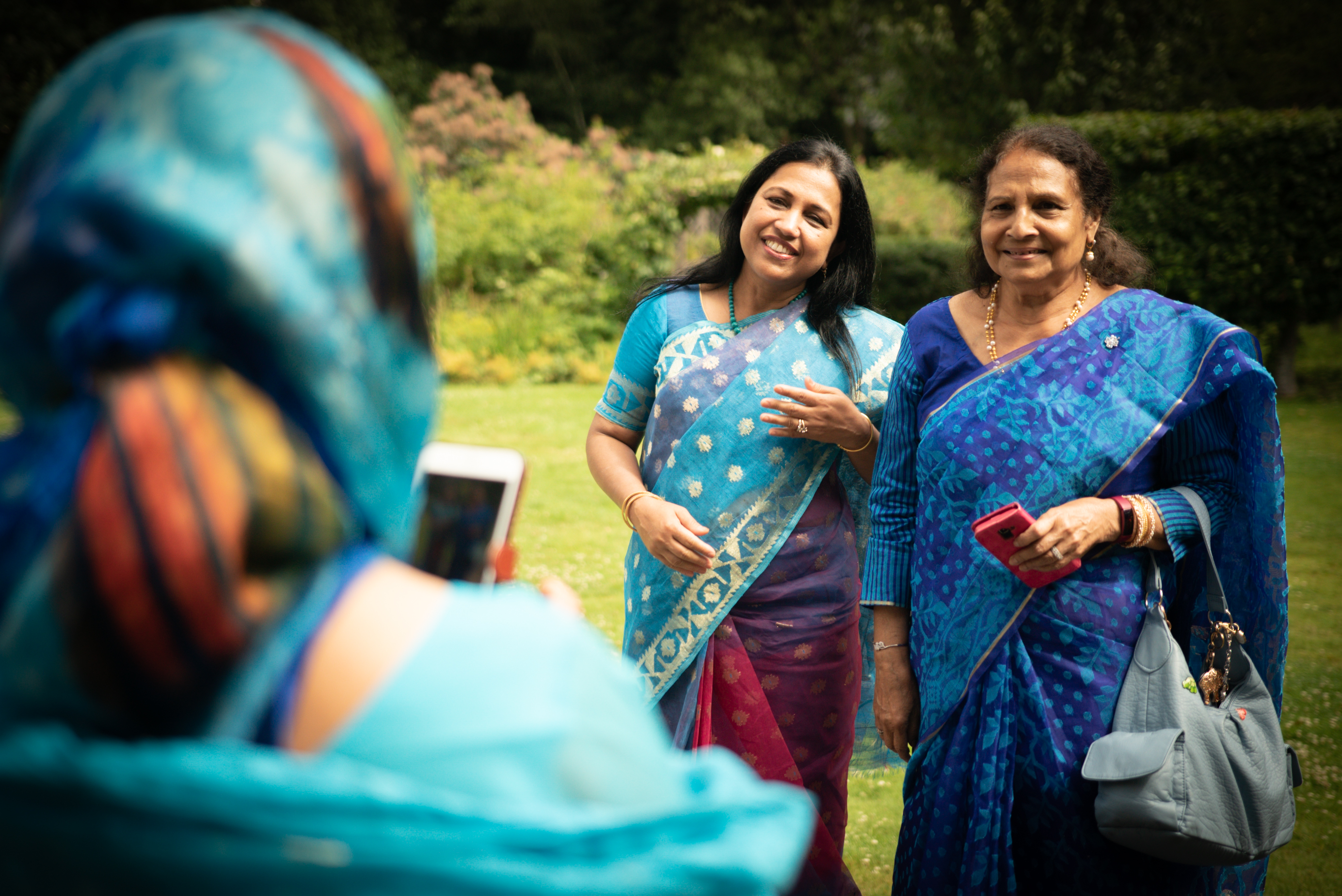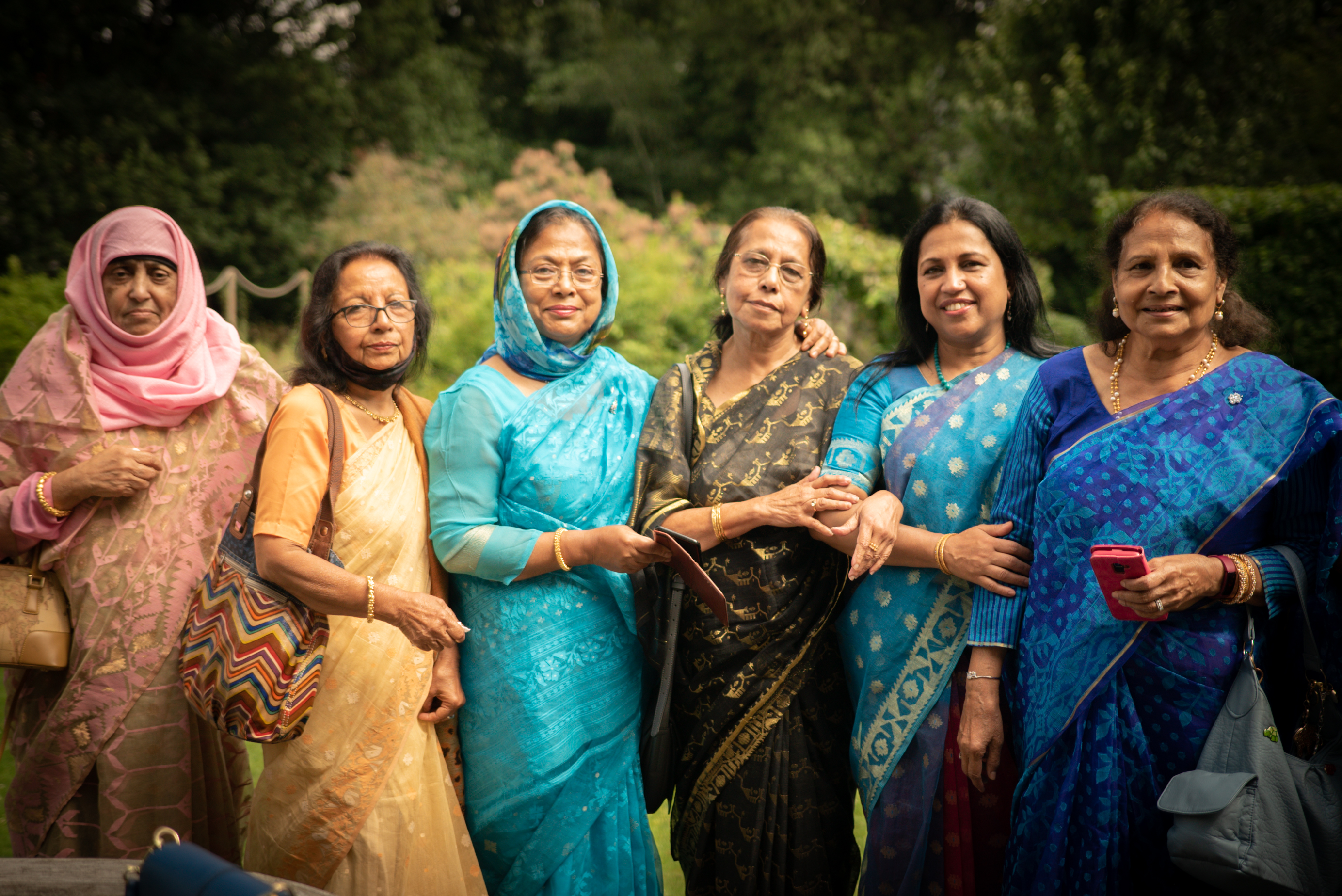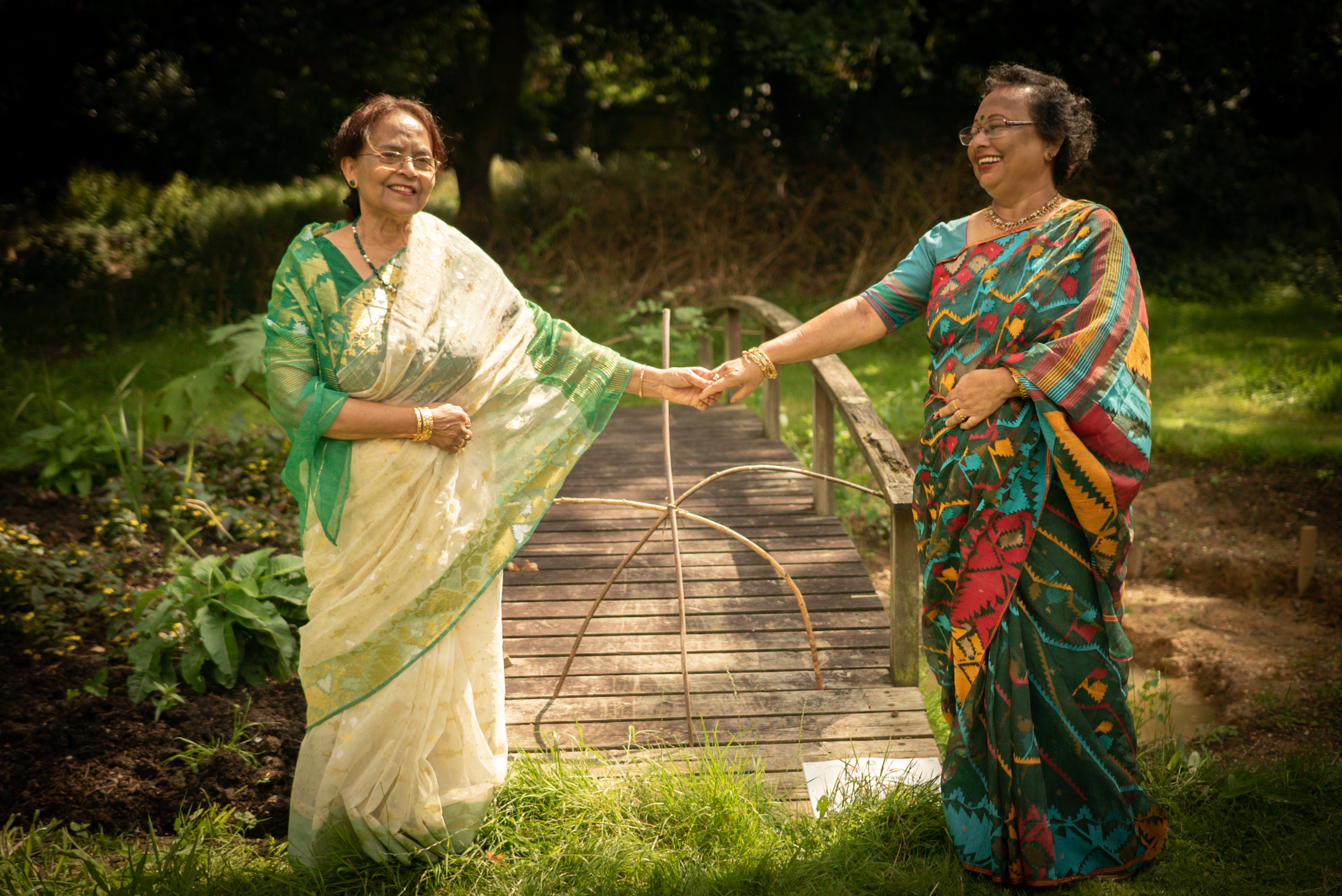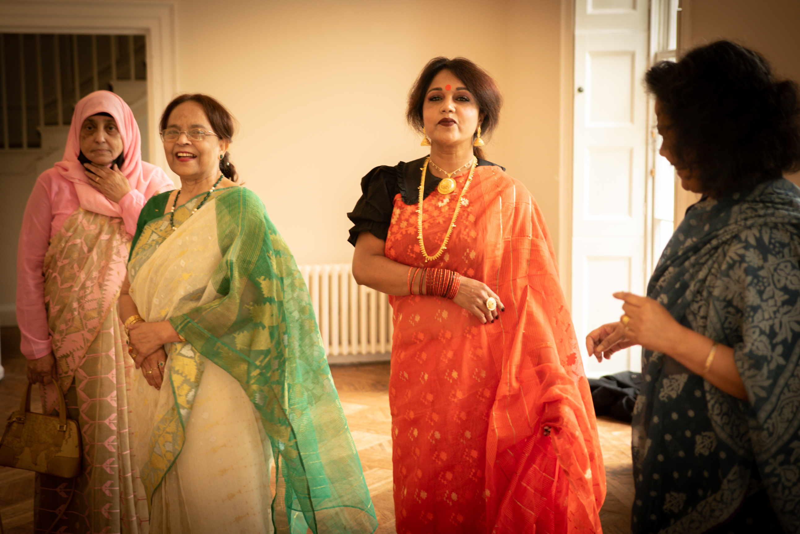 Photographs (above): 24 partcipants and their friends show and share their Jamdani saris during photography days held at Bell House and Morden Hall Park (2021)