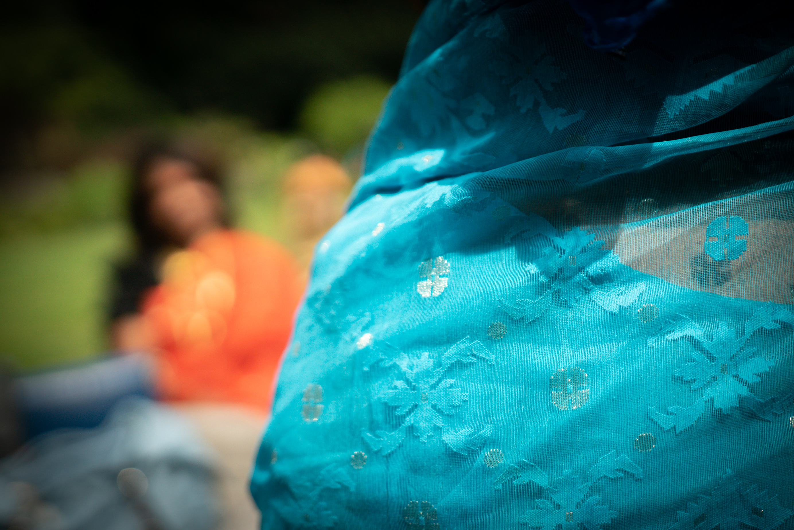 Photographs (above): details of participants’ Jamdani saris taken during photography days held at Bell House and Morden Hall Park (2021)